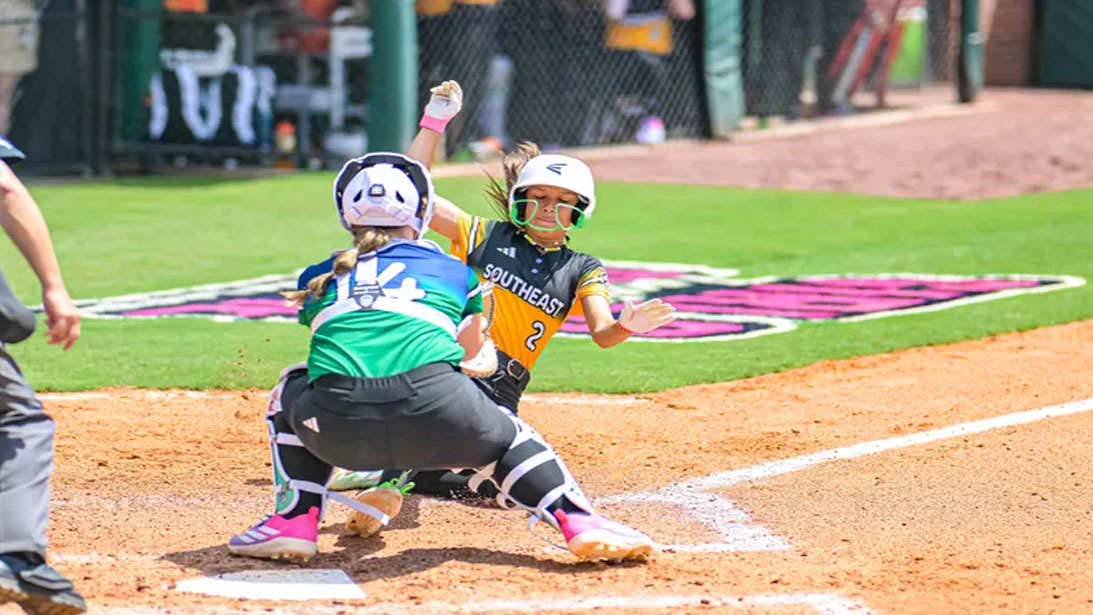 Florida’s Cayden Hugh (No. 2) tries to slide toward home plate as Washington’s Daphnee Calsyn (No. 14) attempts a tag at the 2025 Little League Softball World Series in Greenville, North Carolina